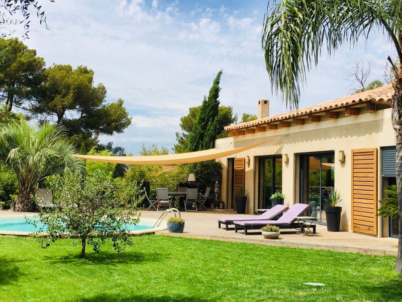 On the Giens peninsula, near the picturesque port of La Madrague. Contemporary architect-designed villa on enclosed grounds in a green setting, planted with trees, not overlooked. Private parking for 4 vehicles. Large living room of 70 m2, very bright, cathedral ceiling, bay windows opening onto terrace, swimming pool and grassy garden. South-West exposure. 3 rooms.