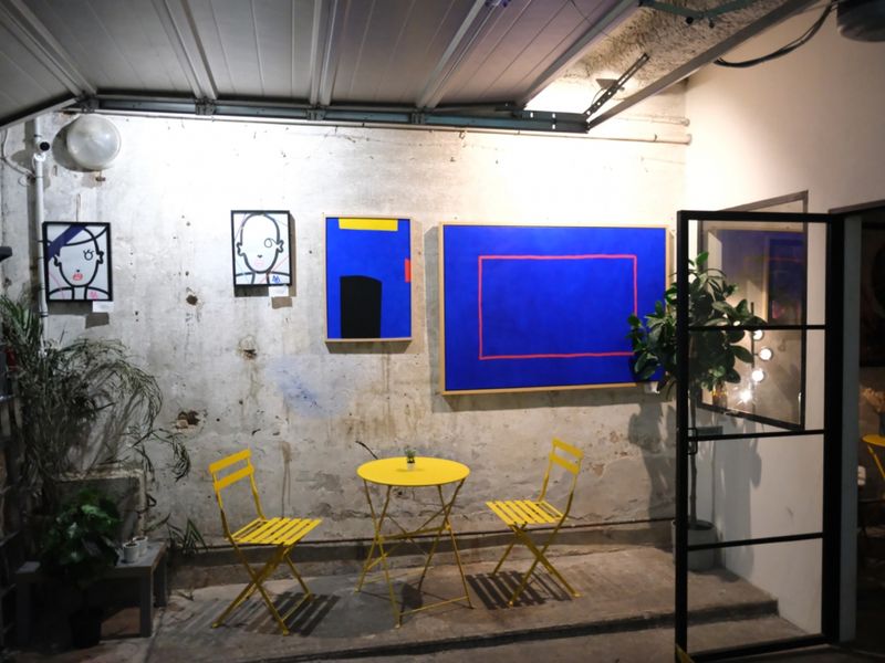 - a ground floor of 70 m² “artist studio” format, raw walls and works flood the place, with a patio overlooking the outside, a small courtyard of 10m2 is also available, it is also the afterwork meeting place , the bar is installed in the gallery;