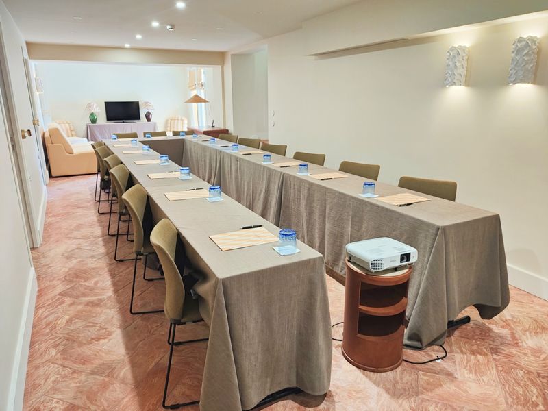 A multi-functional conference room 45 m² with all required amenities for a professional event in any conference layout. We offer by default free internet connection, air conditioning, video projector, flat screen, flip chart, notepads and pens, mineral water and direct phone line. Our Restaurant & Terrace is welcoming you with a Mediterranean cuisine in its lush green setting, for all your events,