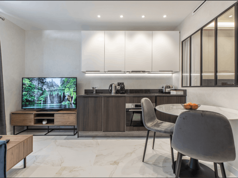 The apartment is located in the city center, near the Palais des Festivals, in a completely renovated building. It has a bedroom and a living room area, fully equipped and air-conditioned, with Wi-Fi access.