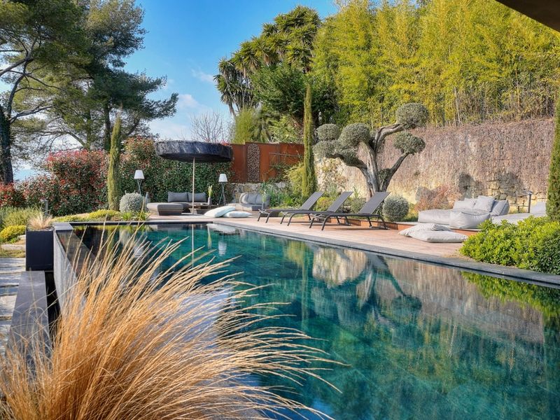 Contemporary style villa and high quality natural materials with breathtaking views of the hills and the greenery of the garden. Mougins is a picturesque, quiet and very secure town, full of luxury mansions and their international owners.