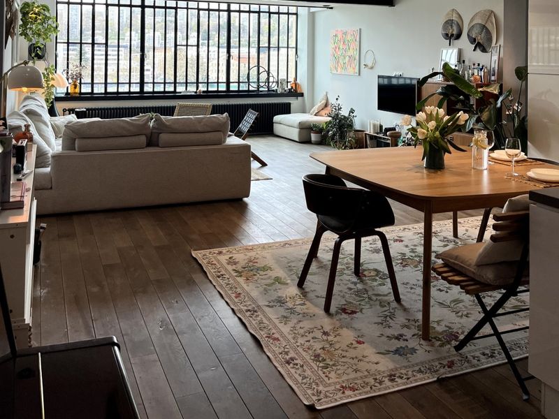 Charm of industrial buildings, equipped kitchen, solid parquet floors and large sofa.