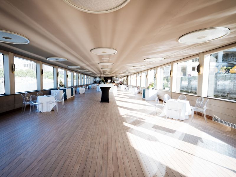 Le Diamant Bleu is a large cruise ship that looks like a yacht. It has a vast 300 m2 terrace and a 400 m2 panoramic lounge allowing it to accommodate up to 400 people seated or 450 people standing, during a cocktail dinner. It is therefore the perfect setting for all types of large-scale events such as: seminars, conferences, shows, fashion shows, business dinners, product launches, etc.