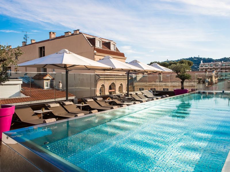 Situated in the historic centre only a couple of minutes from the Palais des Festivals, this rooftop with elegant and stylish modern design offers a unique view across Cannes, an infinity swimming pool, a covered terrace, a bar and a lively vibe with its guest DJ. The 13 metre-long stainless steel heated infinity pool provides a touch of freshness in an exotic and unusual setting, with wooden Cumaru flooring and turquoise walls.